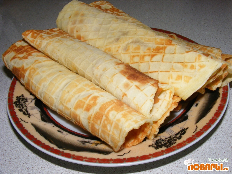 Выливаем тесто в вафельницу, примерно 4 ст.л, выпекаем до золотистой корочки. Еще горячими скручиваем в трубочки. Немного отгибаем трубочку и смазываем вареной сгущенкой, вареньем или сливками. Можно вафельки не скручивать в трубочку, а смазать вареной сгущенкой каждую и сделать тортик. Очень вкусно!