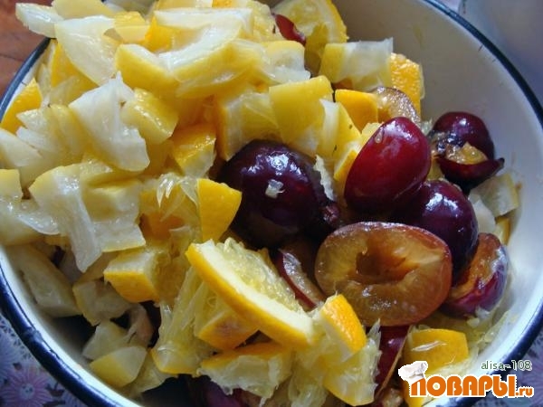 Сливы разрезаем на половинки, вынимаем косточки. Лимон и апельсин нарезаем кубиками, вынимаем косточки.