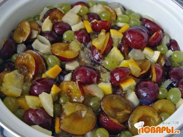 Яблоки и груши очищаем от шкурки, нарезаем кубиками. Добавляем к сливам лимон и апельсин, присыпаем сахаром.