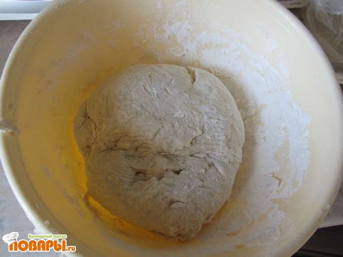 Готовое тесто кладем на час в холодильник.Когда время пройдет, выкладываем его на предварительно посыпанный мукою стол, и раскатываем с помощью качалки . Тесто должно быть толщиной не менее 0,7 см.
