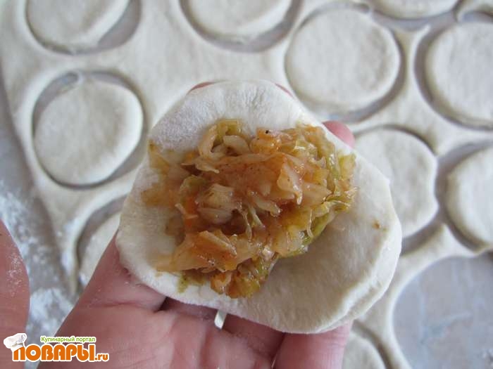 С помощью стакана выдавливаем из теста кружочки. Кружочки из теста еще разминаем и кладем на середину капусту, края заворачиваем и соединяем.