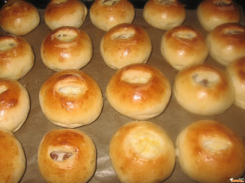 Сформировать шарики ,начинить их творожной массой, сделать ватрушки,сверху смазать желтком и поставить на расстойку,не меньше чем на 15 минут. Выпекаем в духовке при 180 градусах, минут 15.