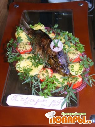 Остывшей готовой начинкой начиняем карпа. Противень застилаем пергаментом и укладываем карпа на животик. Поливаем белым вином и ставим в духовку на 30 минут при тем-ре 220 С. Через время поливая выделившимся соком с вином.