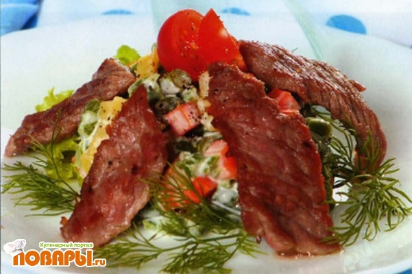 Телятину промыть, обсушить, сбрызнуть винным уксусом, нарезать тонкими ломтиками, слегка отбить. Обжарить на оливковом масле до готовности, по вкусу посолить и поперчить. Салат выложить на тарелку, сверху уложить кусочки обжаренной телятины, украсить зеленью, томатами черри.
