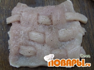 Свинину тонко нарезать, отбивать не стала, т.к. мясо очень нежное. Один кусочек отложить, а другой нарезать полосками шириной 1 см. Сделать небольшие прорези в сплошном кусочке. "Прошить" целый кусок "лентами" из мяса. Обрезать "хвостики".