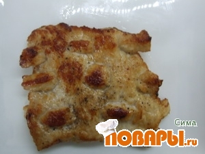 Посолить мясо, поперчить. Быстро обжарить на растительном масле с двух сторон на сильном огне до румяной корочки. Притомить еще 5 мин на маленьком огне и выложить на тарелку.