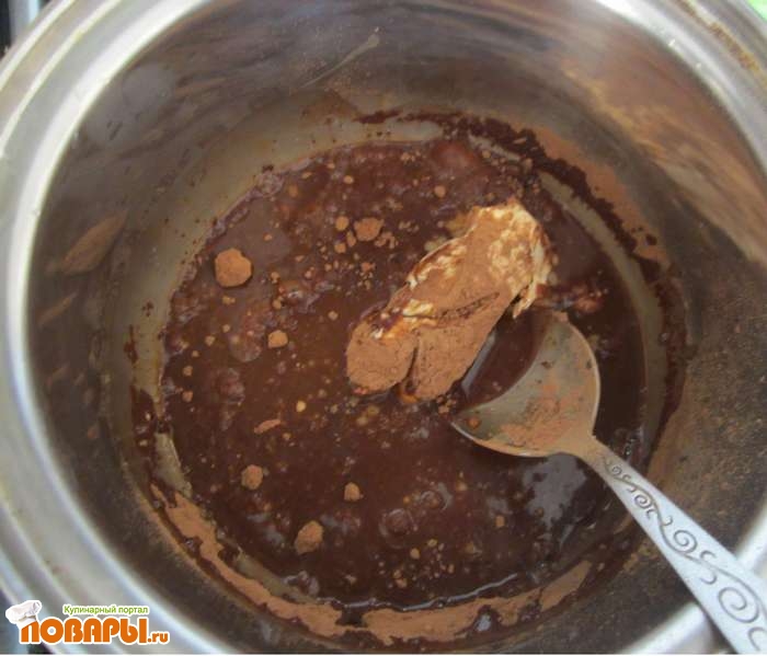 Пока тесто печется, варим шоколад. Для этого перемешиваем сахар, воду, какао порошок и добавляем сливочное масло. Все ставим в кастрюле на маленький огонь и перемешивая варим до получения однородной массы.