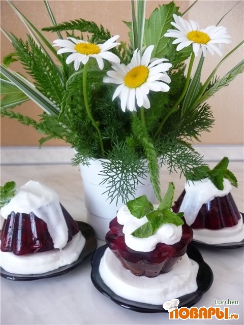 Раскладем вишню в формочки и зальем желе. Поставим в холодильник застывать. На блюдце кладем кусок мороженного, на него желе и поливаем взбитыи сливками.