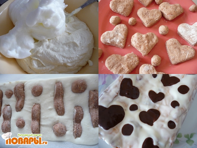 Выкладываем творожную массу в форму для выпечки, которую надо выслать бумагой для выпечки. В массу вталкиваем на разную глубину "сердечки и "шарики".