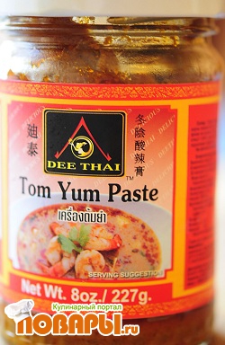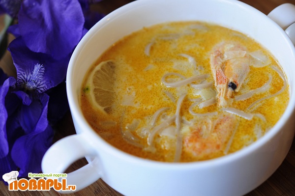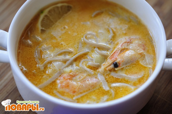 Теперь самое время, в масло положить лук (порезанный мелкими кубиками). Жарим до золотой корочки лук, после добавляем Том Ям пасту и заливаем водой, или куриным бульоном, в среднем 3 стакана. Поварить минут 10 . Добавить креветками, поварить еще минут 5, только заранее хорошо промойте их. Самое время посолить.