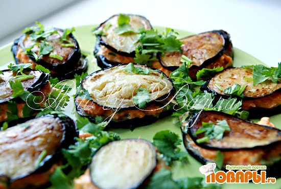 Нарезать баклажаны кружочками и обжарить. Сложить на тарелку на салфетку (чтоб масло стекло). Обжарить морковку, помидоры кубиками, добавить зелень и чеснок, приправы по вкусу.