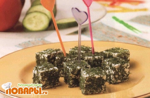 Кубики брынзы запанируйте в зелени укропа и уложите на блюдо.