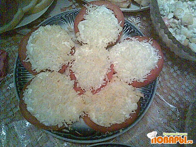 Помидоры режем кружочками. Чеснок выжимаем в чесночнице, смешиваем с майонезом. Кладем чесночный майонез на каждый помидор. Сверху посыпаем тертым сыром. Закуска отличная! Можно делать без чеснока))