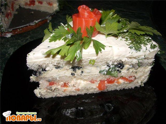 слой черной икры с краб палочками, еще слой хлеба,сверху крем сырный. оставляем на ночь в холодильнике для застывания.