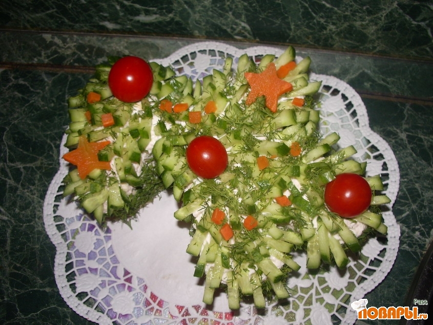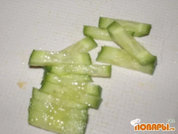 Огурец режем соломкой.Каждый кусочек огурчика - это еловая иголка. И начинаем аккуратно собирать еловую веточку, втыкая кусочки огурца в торт.