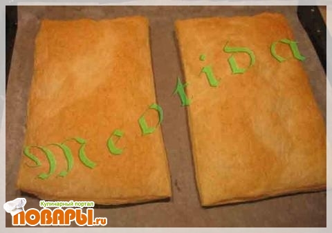 выпекаем в разогретой до 220С духовке до золотистого цвета (как практика показала, разрезать ист на две части не нужно..тортик очень вкусный..так что нужно делать большим )