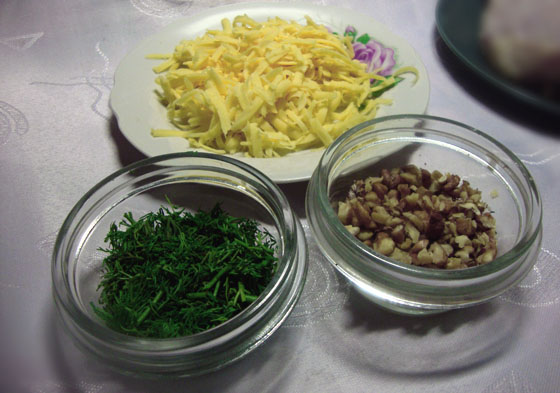 Для этого нужно смешать тертый сыр, укроп, грецкие орехи, давленный чеснок ( я предпочитаю мелко нарубить), и заправить начинку белым соусом или как еще называют бешамель. Так же можно заправить майонезом, но я бы не советовала.