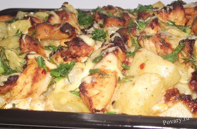 Маринуем куриное филе в сметане и горьком кетчупе, после чего укладываем на сковородку и обжариваем 10 мин.