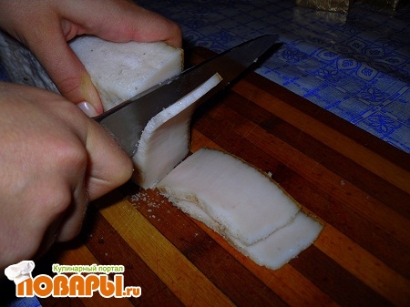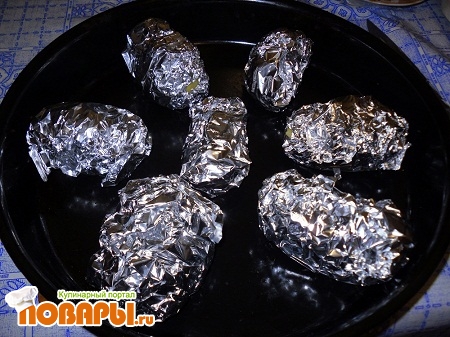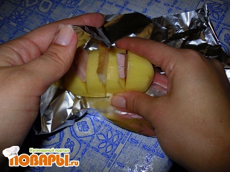 Чередуя мясо с салом, поместите ломтики в разрезы на картофеле. Затем посолите и посыпьте приправой