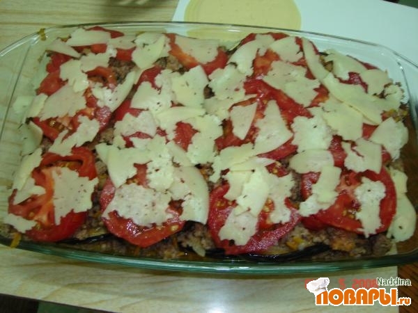 В посуду для запеканки выложить слой фарша с луком и морковью. Потом выложить слой из обжаренных баклажанов, слой оставшегося фарша. Сверху положить кружочки помидоров и посыпать все сыром.