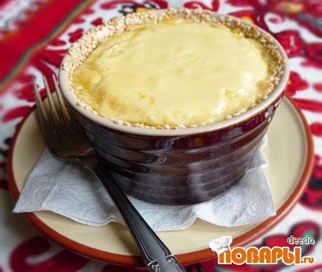 Формочки смазать растительным маслом совсем тонким слоем, присыпать кунжутом. Выложить рис с рыбой в формочки, залить соусом, присыпать тертым сыром.