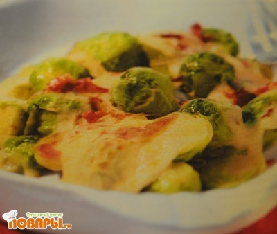 В заранее приготовленном бульоне растворить загуститель соуса, и залить этой месью капусту с беконом. Сыр – измельчить на крупной терке, посыпать запеканку.Запеканку убрать в духовку на 20 минут.