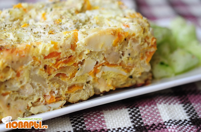 В отдельной посуде перемешать порезанные белки, желтки, лук, морковь, филе, так же добавить 2 яйца. Посолить, добавить черного перца и другие специи по вкусу. Все перемешать.