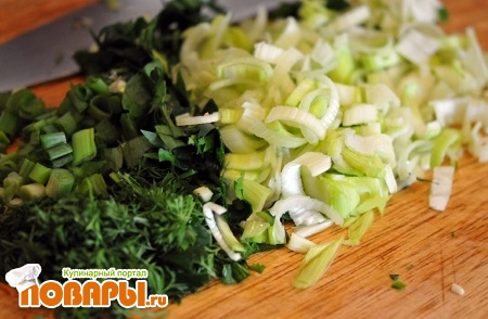 Для нашего блюда нам понадобится много зелени, от его количества зависит сочность и вкус блюда. У меня пучок укропа, петрушка и лук порей. Всю зелень нужно порезать мелко, но не измельчить, так чтобы зелень в процессе готовки могла не только отдать свои соки, но и сама осталась сочной.