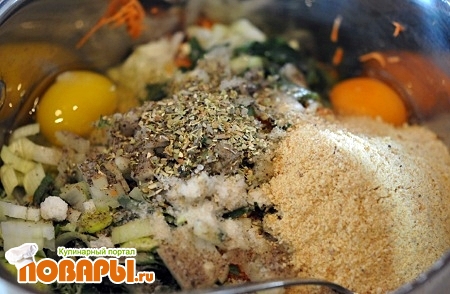 Как только все продукты прошли можно их соединять. Для этого в отдельную посуду выложим заготовочки, добавим яйца 2-3 шт. по желанию, панировочные сухари, зелень, специи (скажу вам по секрету, специи я взяла из Итальянской кухни, поэтому подойдет Итальянский сбор специй). Соль и перец по вкусу.