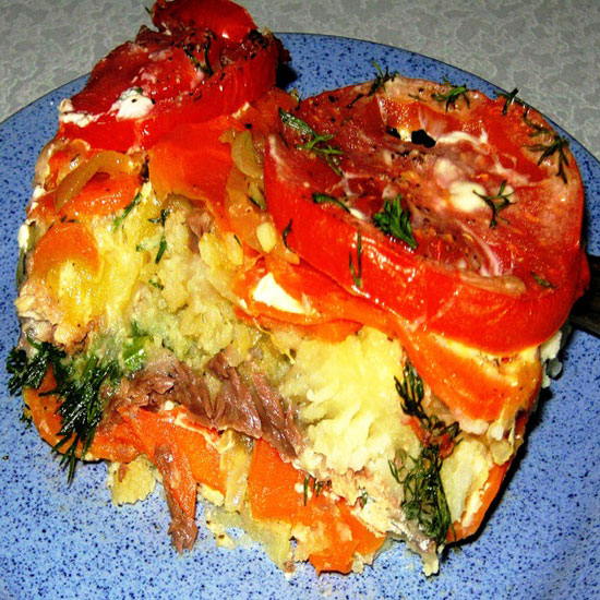 Выложить слои : картофельное пюре, лук, консервированная сайра, морковь, лук, кружочки помидоров. Если картофель варили с добавлением соли, то слои можно не солить, а только посолить соус. Для соуса взбить вручную или блендером яйца и сметану (майонез), что есть в наличии.