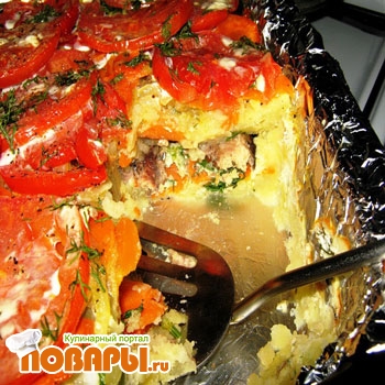 Картофель отварить, и приготовить из него пюре. Лук нарезать полукольцами, корковь- тоненькими кружочками. Противень лучше застелисть фольгой, или если есть уже опыт, готовить такое блюдо в специальном мешке для запекания.