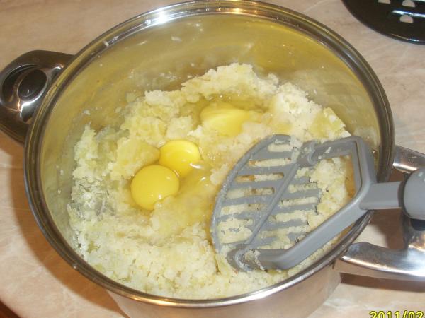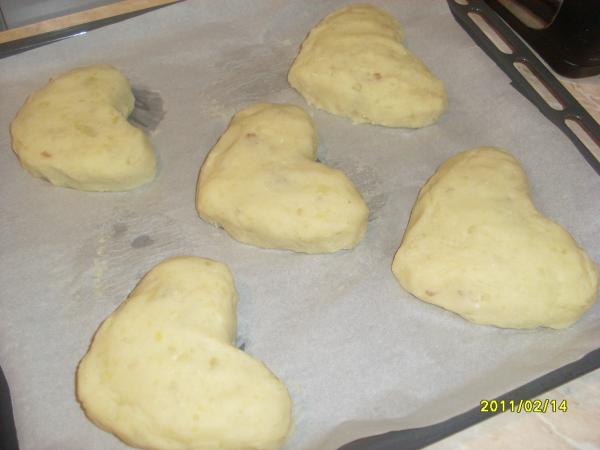 Разделить пюре на пять частей. Из каждой части сделать лепешку, выложить начинку из фарша и слепить "пирожок" в виде сердца и выложить на противень.