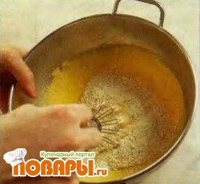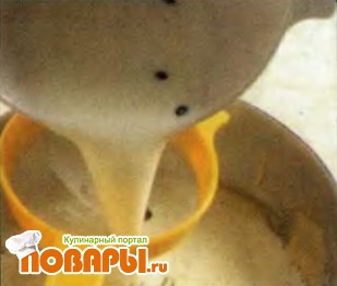 Влейте молоко в яичную смесь через мелкое ситечко, не переставая помешивать до образования однородной массы.