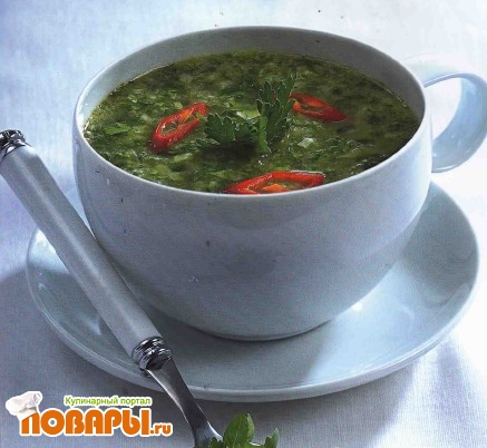 Влейте получившуюся массу в зелень, перемешайте. Разбавьте холодной водой (ее можно предварительно взбить в блендере с колотым льдом). При желании украсьте тонко нарезанным чили и сразу же подавайте, поставив на стол оливковое масло, которым каждый может приправить суп по вкусу.