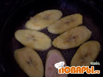 На разогретой сковородке с небольшим количеством растительного масла обжарить банановые дольки до румяного цвета с обеих сторон.