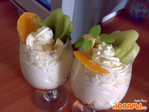 Разложить в криманки, сверху взбитые сливки с сахарной пудрой. Украсить фруктами (у меня апельсин, киви и веточка мидисы). Приятного аппетита!!!