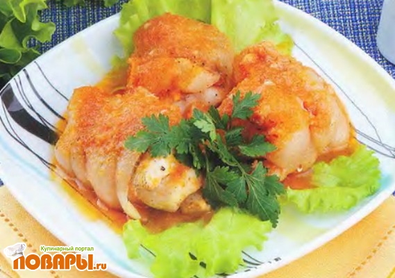 Свиное сало порезать на тонкие ломтики. Каждый кусок рыбы завернуть в ломтик сала, обжарить.