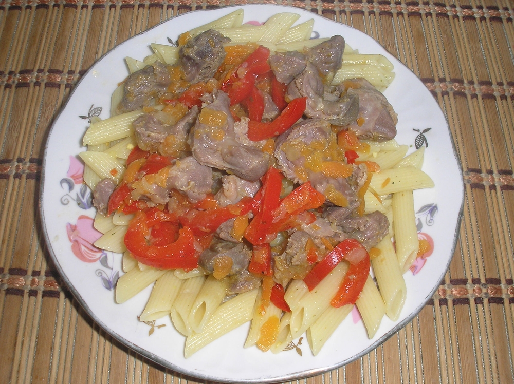 Лук очистить и порезать. морковь очистить и натереть на тёрке, всё обжарить на масле. Затем в сковороду положить желудки, посолить, посыпать приправы, добавить немного воды или бульона, и тушить на небольшом огне.