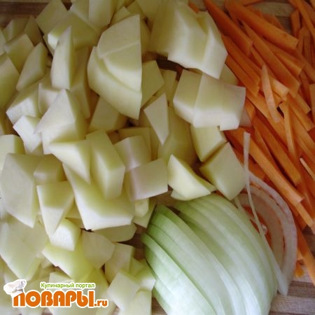 Клубни чистим и режим квадратиками-кубиками. Лук и морковь можно накрошить, а можно нашинковать (или натереть) и полукольцами нарезать.