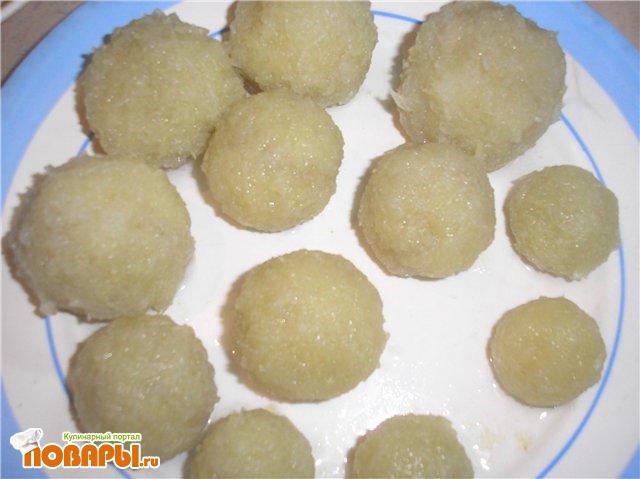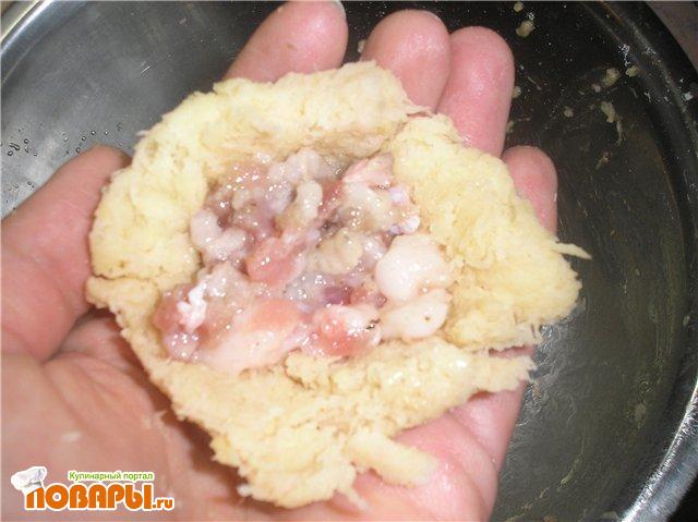 Из натёртого картофеля отжимаем крахмал и лепим клёцки. 4 большие с фаршем, 4 поменьше тоже с фаршем и ещё 4 маленькие без начинки.
