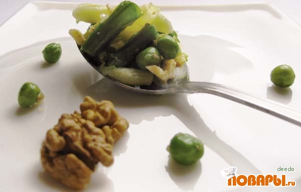 Теплую фасоль с горошком выложить в салатник, посыпать орехами и чесноком, добавить чайную ложку яблочного уксуса и столовую ложку масла.