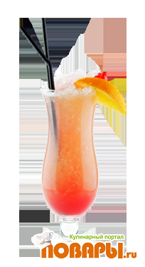 Налей в шейкер: апельсиновый сок 30 мл, ананасовый сок 30 мл, вишневый бренди 15 мл, гренадин 5 мл, абрикосовый бренди 15 мл, золотой ром 20 мл, темный ром 20 мл, белый ром 20 мл