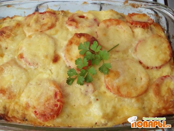 Сверху выкладываем тонок нарезанный помидор. Сметану смешиваем с яйцами, слегка взбиваем, солим и выливаем на запеканку.