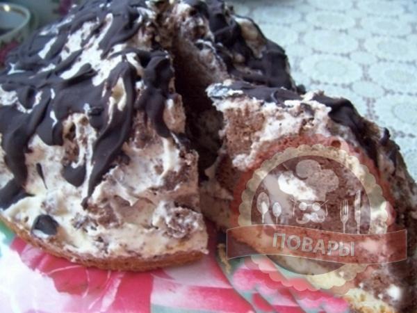 Выпекаем корж примерно 40 минут, при температуре 180 градусов. Корж вынимаем из духовки, отрезаем нижний белый слой. Смазываем его кремом. Коричневый слой нарезаем на кубики и обмакиваем в крем, выкладываем на белый корж. Все хорошо заливаем сметаной и украшаем при желании шоколадной глазурью. Торт должен настояться хотя бы ночь.