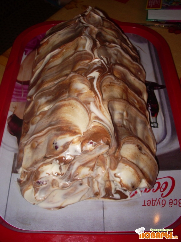 Выкладываем первый ряд из 4 трубочек, обильно облепляем кремом, в шахматном порядке кладем еще 3 трубочки и тоже облепляем кремом, потом 2 и 1. Трубочек за кремом не должно быть видно. Сверху брызгаем шоколадной глазурью и ложкой делаем декоративные волны. В холодильник для пропитки приблизительно на сутки.