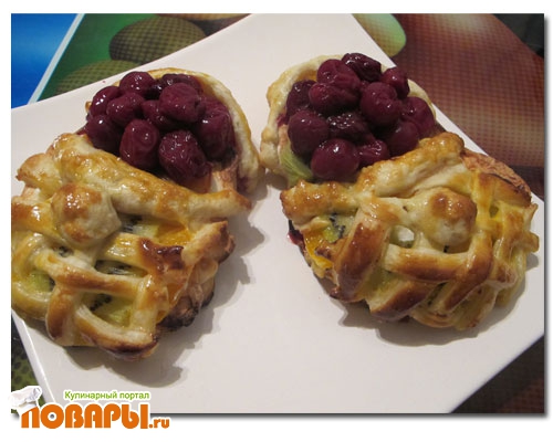 Делаем бортик из теста для задней части ступни. Формируем начинку - слой творога, яблоко, киви, вишня (предварительно нарезать тонкими ломтиками фрукты). Сверху положить сеточку из полос теста, закрывая начинку, формируя носок лаптя. Сладкий лапоть готов.