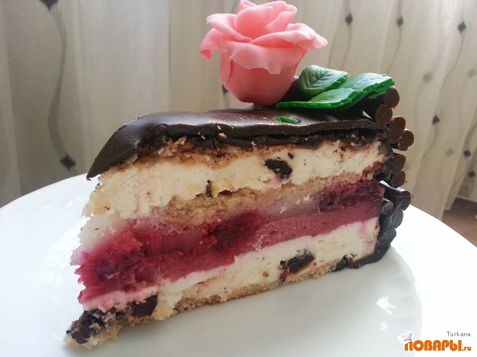 Готовый корж полностью остудить, разрезать по высоте на две половины, каждую из которых разделить еще раз на 2 коржа. Получится 4 тонких коржа. Слегка пропитать вишневой пропиткой каждый из коржей.