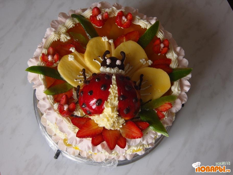 9. Украсить бока торта оборками из мастики, цукатами, виноградом, разрезанным пополам, орнаментом из крема.