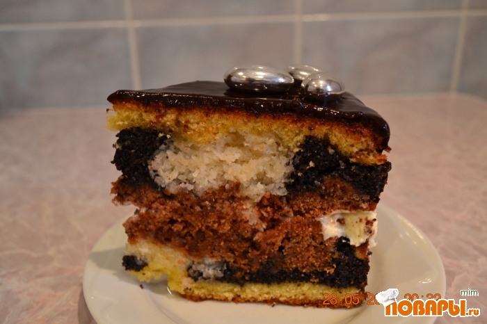 И так,выкладываем 1 половину белого теста,далее в произвольном порядке выливаем половину массы кокосовой и половину массы маковой,и сверху,на крупную терку, натираем 1 часть теста темного.Выпекаем при температуре 200 градусов,35- 40 минут.