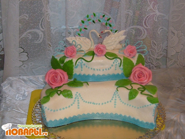 Один корж смочить немного сахарным сиропом, намазать густо кремом и выложить слой вишни (размороженной и без сока), которую немного вдавить в крем. Сверху положить ещё немного крема, закрывая вишню, далее ещё один пласт шоколадного бисквита, придать торту нужную форму, обмазать кремом масло со сгущёнкой и покрыть мастикой, украсить.